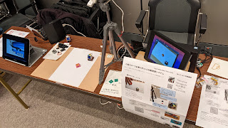 内容はクローラ台車型ロボットと自動制御システムです。MFTokyo2022の時と同様、説明映像を常時上映しました。但し今回は機材は全て手持ち搬入で、荷物を増やしたくなかったのでChromebookの内蔵ディスプレイ(約9インチ)を使いました。以前公開た紹介動画のように対象物体を動かしてロボットが追いかけるという内容の展示を行いました。
